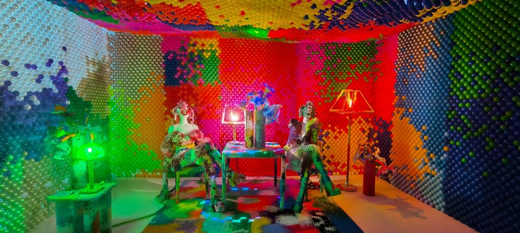 In the 300m2 exhibition space in Lausanne, colour occupies the room rather than decorate it. Dresses stand upright on their own, dense with beads, sequins, fragments of materials that once belonged elsewhere. The light hits them and breaks apart. From a distance, it looks celebratory. Up close, it’s something else entirely.